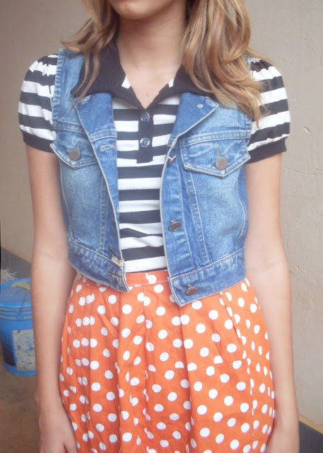 O look de hoje, com uma tendência que gosto muito. O mix de estampas. Usei a camisa polo listrada e a saia (minha nova paixão) dessa cor indeterminada com polka dots.